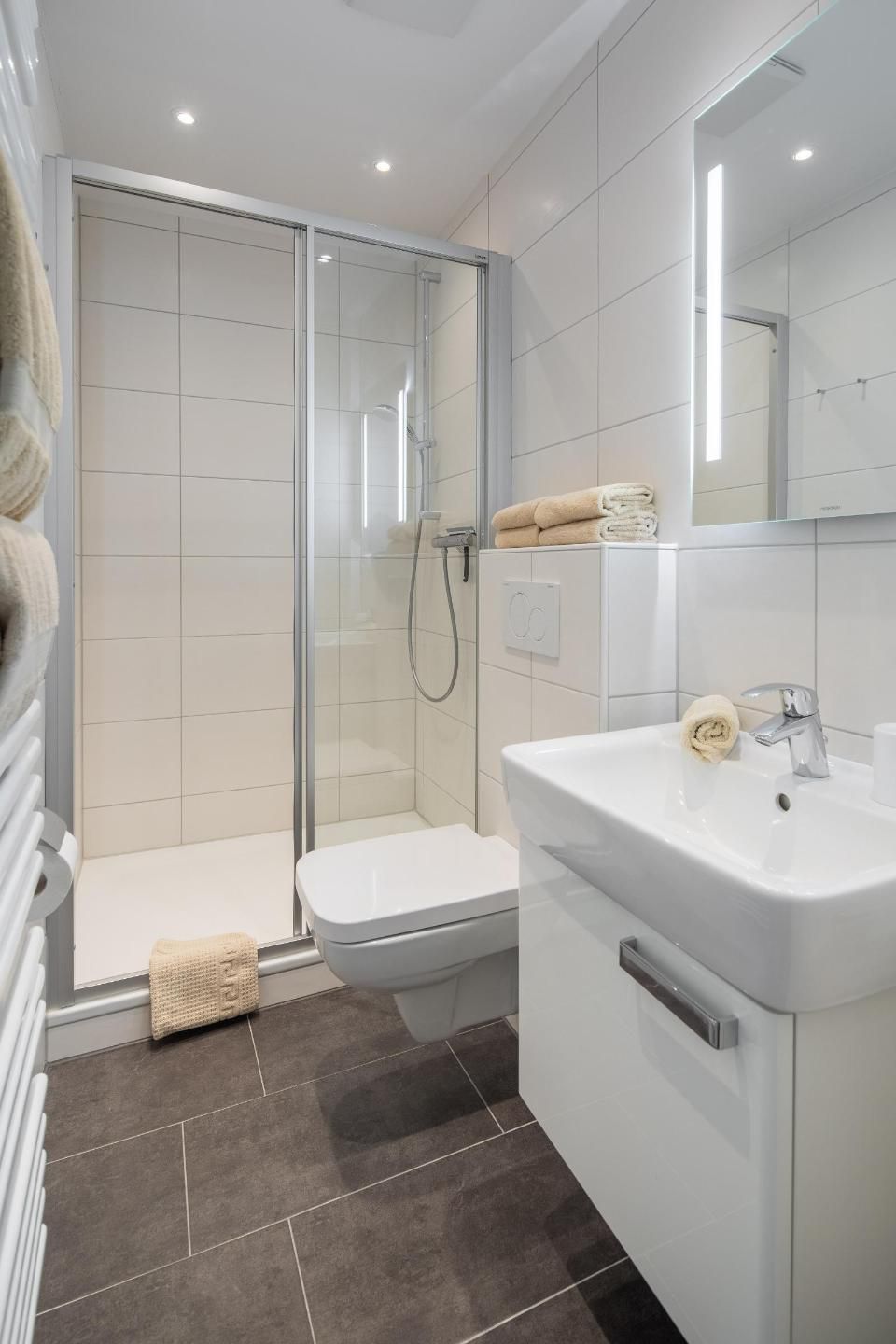 Helles Bad modern mit Dusche, WC, Handtuchheizkörper und Fön ausgestattet. Handtücher und Bettwäsche inklusive. Waschmaschine und Trockner im Haus verfügbar.